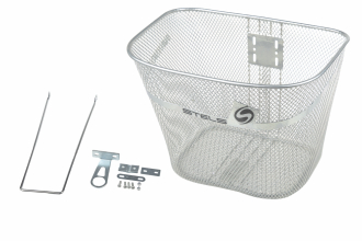 Велокорзина JL-044-3 передняя 35х24.5х28см для дорожных велосипедов 26" с креплением за ось втулок, стальная, серебристая с логотипом STELS.